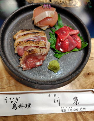 ホロホロ鳥の刺身盛り合わせ1800円と鰻重特3500円が今夜の目玉