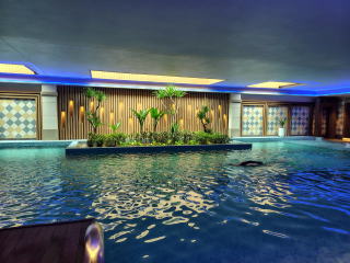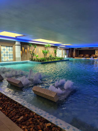 SPAの先に25m程の温水プールがあり紫外線がないのでジャグジー付きソファーで寛ぎ