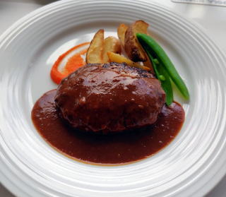 右の粗挽きハンバーグに比べ左のワンプレートランチは美しい